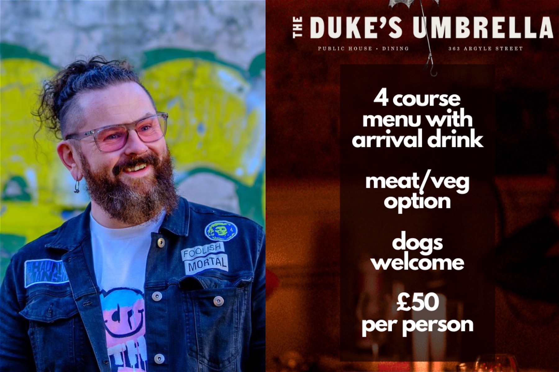 You will spend the evening blind-folded, amercing yourself in the atmosphere of The Dukes Umbrella, with different sounds & smells surrounding you. You’ll receive an arrival drink (cocktail or mocktail), 4 course menu (meat or veggie, dietaries catered for) and be part of the first event of its kind in Glasgow, with £10 from every meal being donated directly to Guide Dog Scotland.